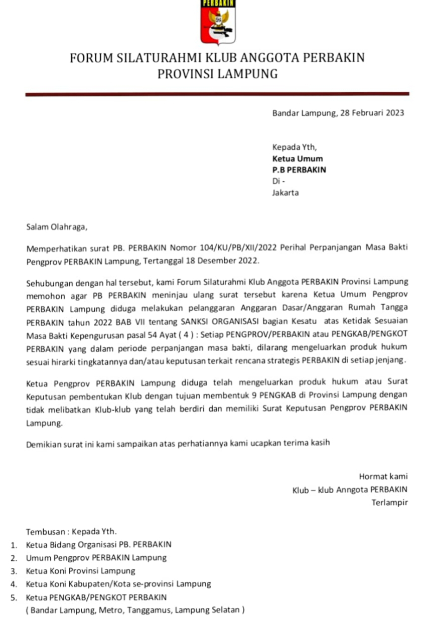 Mewakili Peserta Forum Ungkap kang ujang, banyak yang belum mengetahui adanya surat Perpanjang masa bakti kepengurusan Perbakin lampung, yang sepengetahun kawan-kawan telah berakhir bulan desember tahun 2022, kami justru banyak tak paham adanya surat perpanjang tersebut, "Bedasarkan Surat PB perbakin atas permohonan Perpanjangan Masa bakti Kepngurusan Perbakin lampung, makan Ketum PB menyetujuinya bedasarkan nomor surat, 104/KU/PB/XII/2022. Perhal, Perpanjangan Masa Bakti Pengprov Perbakin Lampung, Atas dasar tersebut PB Perbakin memberikan Rujukan, 1. memberikan Persetujuan Perpanjangan Masa bakti kepengurusan Perbakin Lampung. 2. Menegaskan untuk pelaksanaan Musyawarah Perbakin Provinsi Lampung, agar di selengarakan selambatnya sampai tanggal 16 juni 2023, dengan tetap berpedoman kepada ketentuan Anggaran Dasar dan anggaran rumah tangga PERBAKIN tahun 2022. di tanda tangani Ketua Umum Pengurus Besar Perbakin tertanggal 18 desember 2022, Joni Supriyanto".